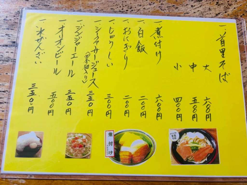 首里そばのメニューはとてもシンプルで、沖縄そばは看板メニューの「首里そば」一択。